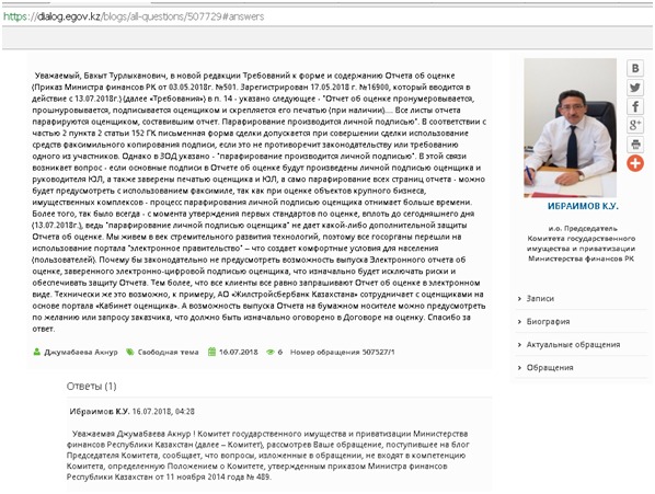 мое обращение с номером 507527/1, относительно факсимиле, указанных в п. 14 новой редакции Требований к форме и содержанию Отчета об оценке (утвержденных Приказом Министра финансов РК от 03.05.2018г. №501. Зарегистрированного 17.05.2018 г. №16900, который введен в действие с 13.07.2018г.), Был перенаправлен в Комитет государственного имущества и приватизации Министерства финансов РК - и от и.о. Председателя комитета Ибрагимова К.У. – был получен ответ следующего содержания: Ибраимов К.У. 16.07.2018, 04:28 Уважаемая Джумабаева Акнур! Комитет государственного имущества и приватизации Министерства финансов Республики Казахстан (далее – Комитет), рассмотрев Ваше обращение, поступившее на блог Председателя Комитета, сообщает, что вопросы, изложенные в обращении, не входят в компетенцию Комитета, определенную Положением о Комитете, утвержденным приказом Министра финансов Республики Казахстан от 11 ноября 2014 года № 489. Тогда как, согласно Постановлению Правительства РК от 24 апреля 2008 года №387 «О некоторых вопросах Министерства финансов Республики Казахстан» (с изменениями и дополнениями по состоянию на 29.06.2018 г.)