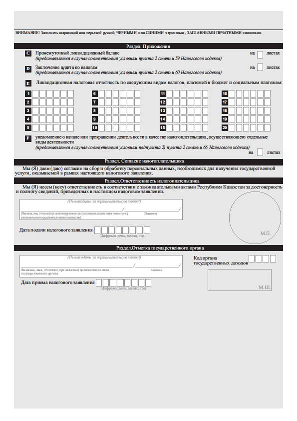 2) ликвидационная налоговая отчетность в связи с ликвидацией юридического лица-резидента Республики Казахстан, их филиалов, представительств, реорганизацией юридического лица, прекращением деятельности структурного подразделения юридического лица-нерезидента, юридического лица-нерезидента, осуществляющего деятельность на территории Республики Казахстан без открытия филиала, представительства;