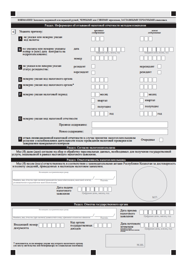 налоговое заявление в форме электронного документа, согласно приложению 1 к настоящему стандарту государственной услуги - для внесения изменений и (или) дополнений сведений об ответственном работнике по расчетам с бюджетом, номере телефона, адресе электронной почты услугополучателя.