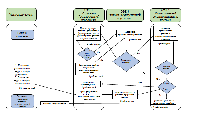 19) процесс 13 - получение услугополучателем результата услуги (уведомление о назначении пособия либо об отказе в назначении пособия с указанием причины) в форме электронного документа. Электронный документ формируется АИС услугодателя с использованием ЭЦП уполномоченного лица услугодателя.