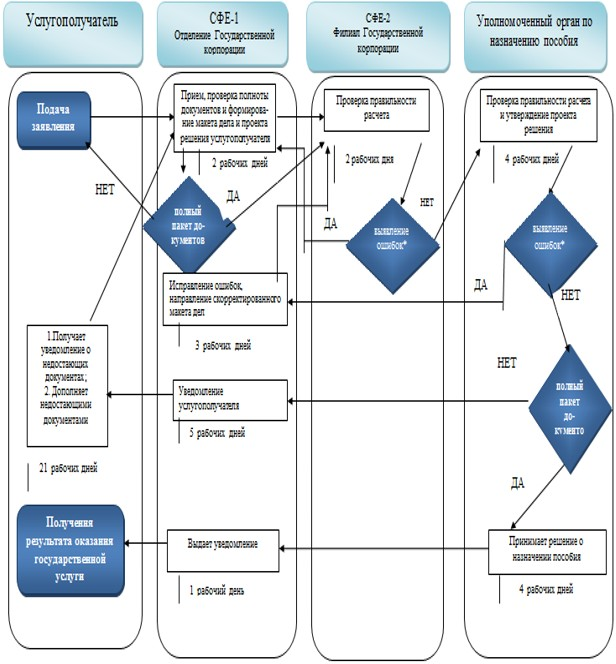 1) отделение Государственной корпорации в течение 3 (трех) рабочих дней дооформляет электронный макет дела, проверяет правильность расчета размера пособия, оформляет электронный проект решения, удостоверяет его ЭЦП и направляет в филиал Государственной корпорации;