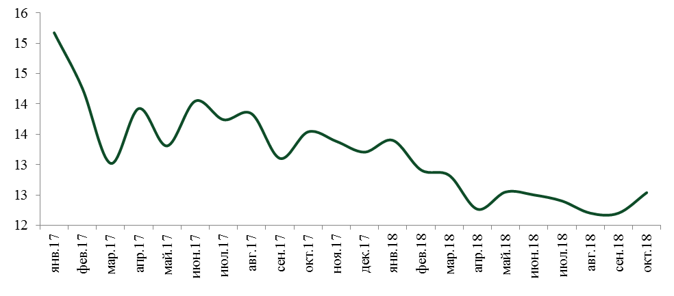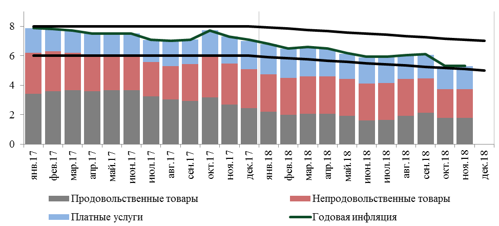 Годовая инфляция в 2018 году демонстрировала тенденцию на снижение, достигнув к ноябрю отметки в 5,3% (в декабре 2017 года - 7,1%), что близко к нижней границе целевого коридора (рисунок 1). До конца года ожидается сохранение инфляции внутри коридора.