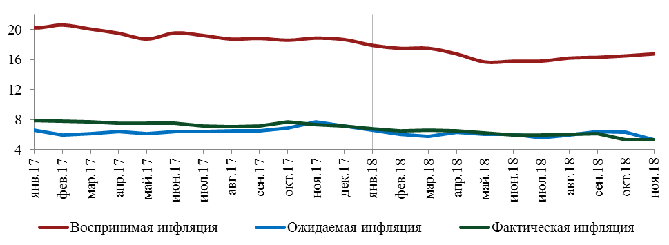 Восприятие инфляции и ожидания населения по инфляции продолжили долгосрочный тренд на снижение. Однако в краткосрочной перспективе инфляционные ожидания остаются неустойчивыми и подверженными негативному влиянию факторов, особенно со стороны предложения на отдельных товарных рынках и обменного курса. Учитывая, что выборка респондентов для опроса характеризует среднестатистического жителя страны, а не профессиональных экономистов и финансистов, оценки носят субъективный характер и зачастую являются завышенными. Так, в ноябре 2018 года воспринимаемая инфляция населения, рассчитанная на основе количественного вопроса (респондентам предлагалось самостоятельно назвать цифру инфляции за последние 12 месяцев), составила 16,8%, что более чем в 3 раза выше фактической инфляции. Тем не менее, динамика инфляционных ожиданий достаточно хорошо отражает степень инфляционных рисков. В этой связи, это один из ключевых индикаторов при принятии решения по уровню базовой ставки.