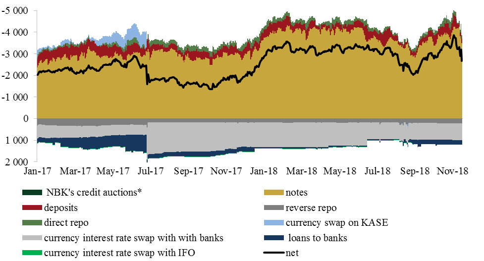 В 2018 году в банковской системе сохранялся структурный профицит тенговой ликвидности (рисунок 3). Основной объем ликвидности изымался Национальным Банком при помощи краткосрочных нот со сроками обращения 7 и 28 дней. Выпуски краткосрочных нот со сроками обращения 3, 6 и 12 месяцев были направлены на построение кривой доходности на финансовом рынке.