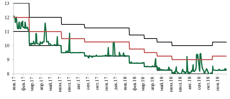 На фоне более высоких, чем ожидалось ранее, темпов замедления инфляции Национальный Банк в течение первой половины 2018 года принимал решения по последовательному снижению базовой ставки - с 10,25% до 9,00% в июне.