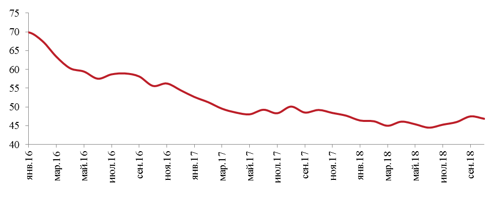 База фондирования банков, преимущественно представленная вкладами клиентов, демонстрировала продолжение тренда на дедолларизацию - до 46,9% на конец октября 2018 года (рисунок 6). Дедолларизации способствует арбитраж между тенговыми и валютными вкладами.