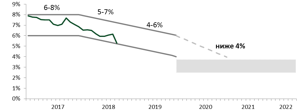 В 2019 году денежно-кредитная политика будет проводиться в соответствии с принципами инфляционного таргетирования. Меры Национального Банка будут направлены на обеспечение поступательного снижения инфляции до значения, ниже, но близкого к 4% в 2020 году и дальнейшего поддержания инфляции на данном уровне. В соответствии со среднесрочной стратегией Национальный Банк снижает целевой коридор инфляции в 2019 году на один процентный пункт до 4-6% (рисунок 7).