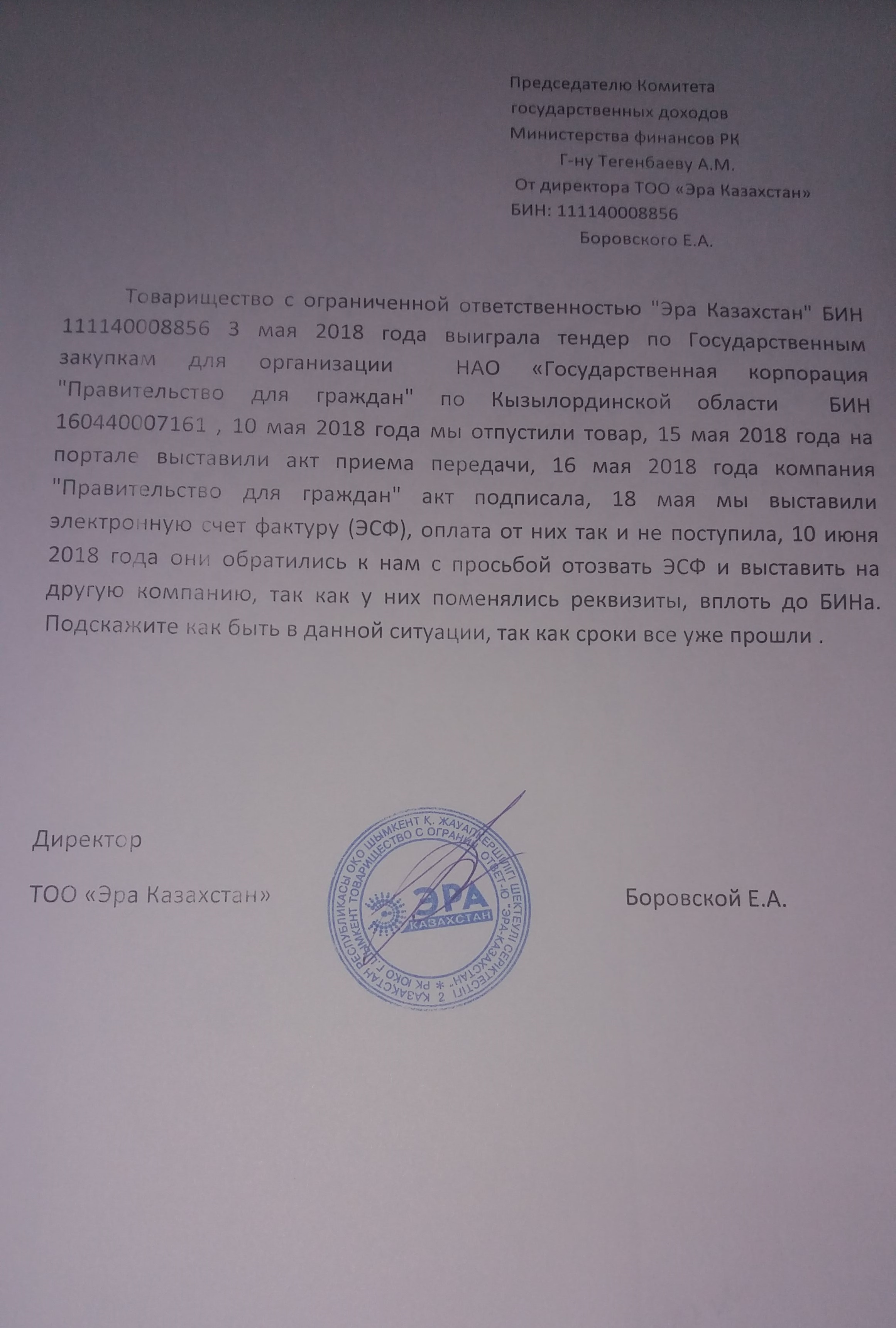 Я, Боровской Евгений Анатольевич, являюсь директором ТОО "Эра Казахстан" БИН 111140008856, прошу Вас объяснить как нам поступить в сложившейся ситуации. Описание во вложенном файле